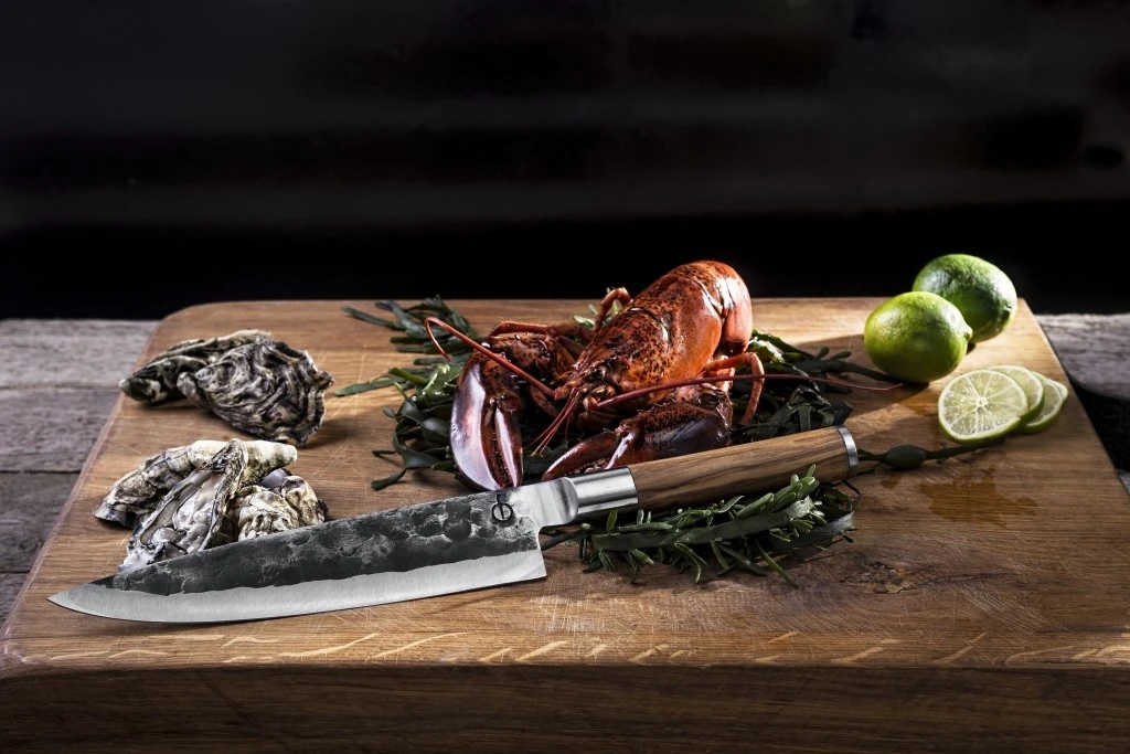 De Olive Forged messen hebben een prachtige olijfhouten handgreep, de handgreep is extra opvallend door de doorlopende krop en de toegevoegde pommel op de achterzijde. De pommel is afgewerkt in dezelfde stijl als het lemmet, waardoor alles één mooi geheel wordt. Het mes is vlijmscherp en ligt het voortreffelijk in de hand. Het lemmet heeft een gehamerde structuur. waardoor het uniek in zijn soort is