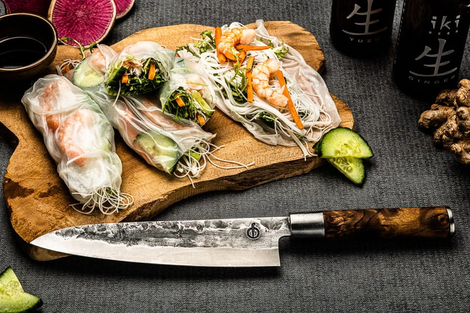 Een santoku schommelt niet op het snijoppervlak zoals het lemmet van een koksmes, dit komt door het platte lemmet. Je houdt een santoku vast bij het handvat en snijdt met een beweging van achter-boven naar beneden-voor. Bij elke snede verliest het lemmet dus contact met de snijplank.
