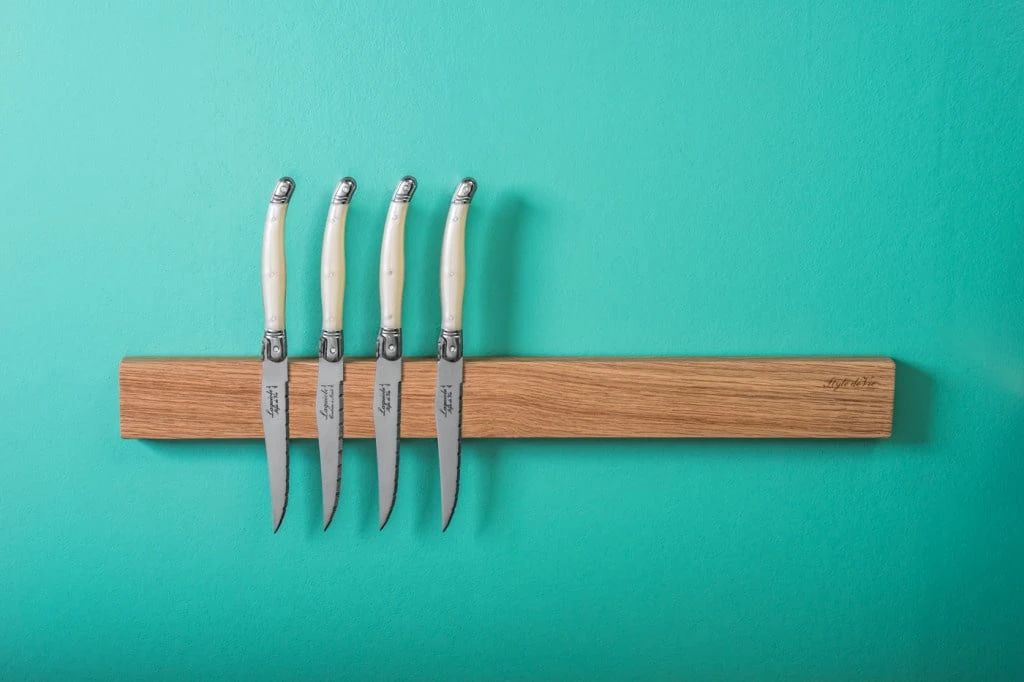 Deze magneetstrip van Style de Vie is verkrijgbaar in een Eikenhout of walnoot uitvoering. De magneetstrip heeft een lengte van 50cm en biedt plek voor circa 10 messen (afhankelijk van het type mes). De magneetstrip kan met twee schroeven (meegeleverd) worden bevestigd.Â
